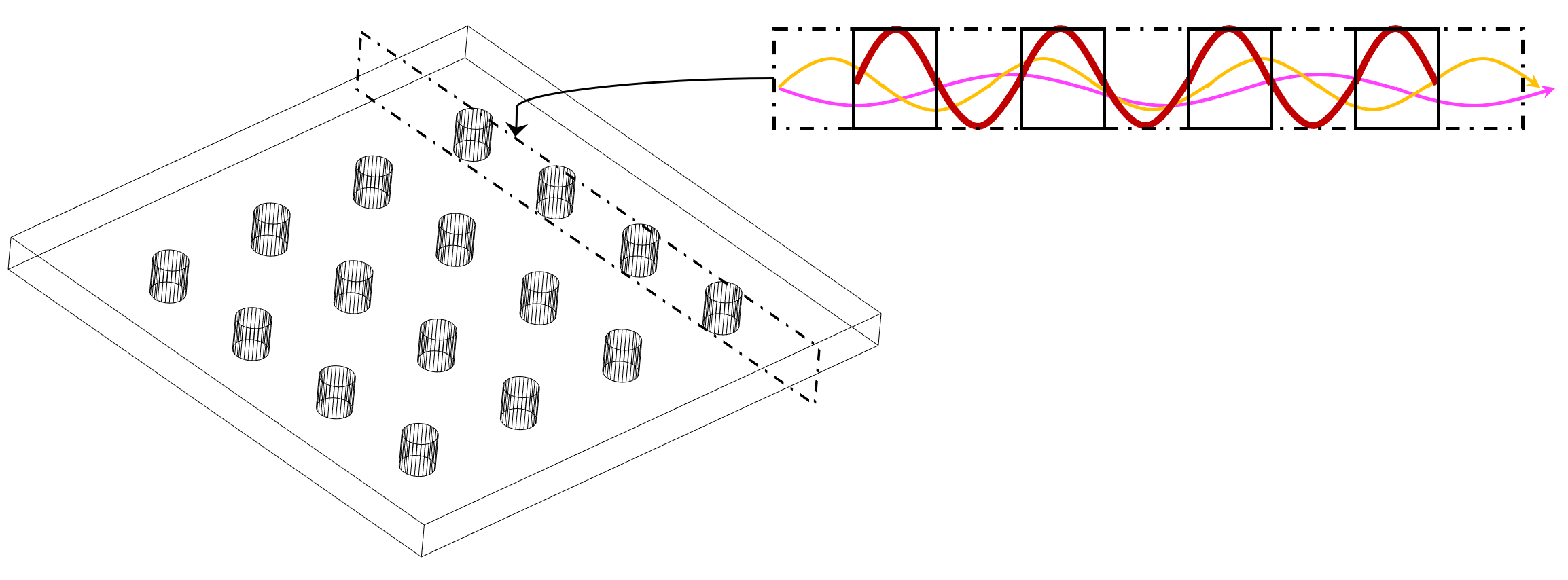 Just the right size and shape of these holes placed at just the right increment will create reflections and bends that result in standing waves - a particular wavelength of light that does not move through the material, whereas all other wavelengths move on through.