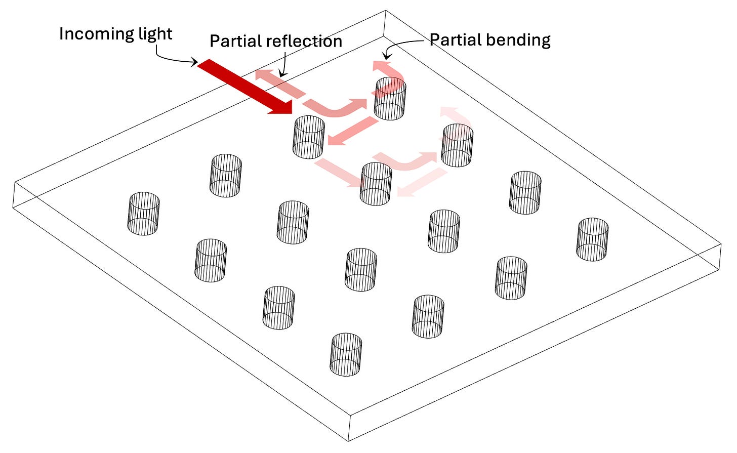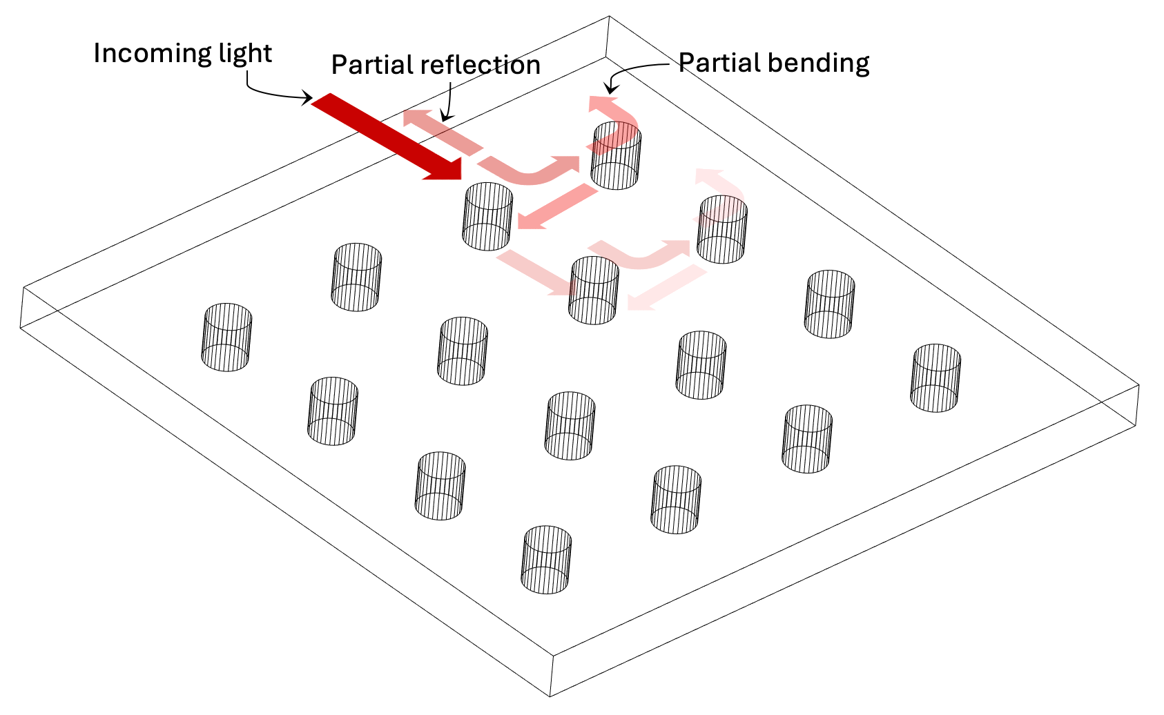 Disruptions create reflection and bending of light - think about sunlight both reflecting off of a lake and bending to make a fish look like it’s in a different spot than it actually is. Each hole partially reflects and partially bends the incoming light, which causes the next hole to partially reflect and partially bend the light, and so on and so on.